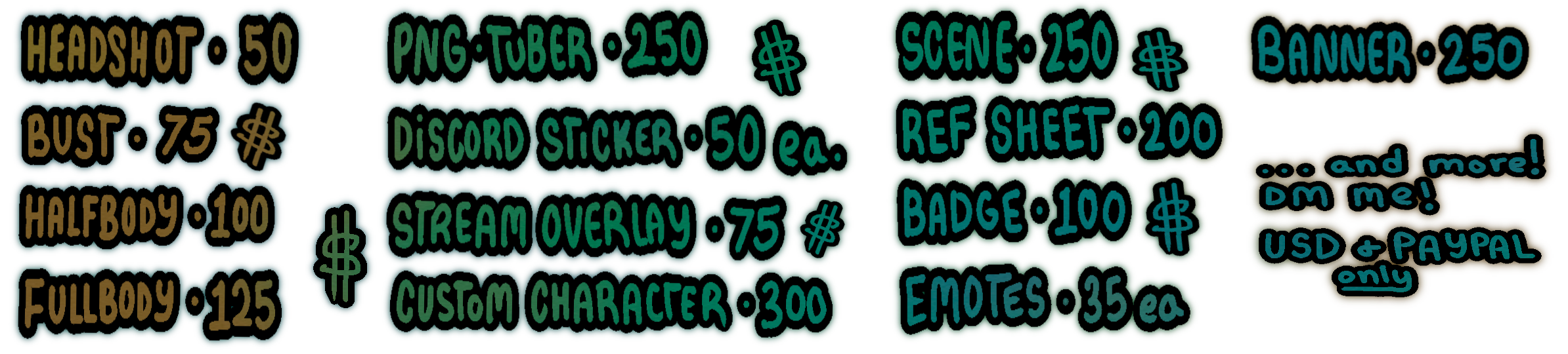 → NSFW Commissions will be pricier because of the skills + time required <3Listed prices are the base price. Please understand that prices may increase due to complexity/additional details/add-ons.